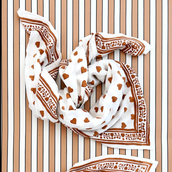 Nos foulards sont imprimés à la main à Jaipur avec la technique traditionnelle du block print. Chaque pièce est unique, avec ses petites irrégularités qui font tout son charme. Comme chaque collection est réalisée en série limitée, les couleurs varient d’une production à l’autre : votre duo est vraiment exclusif !