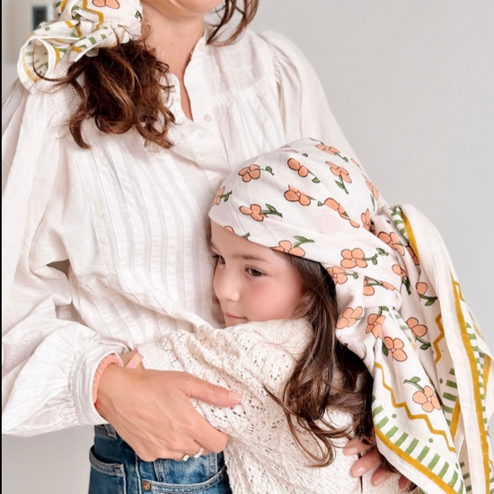 Un foulard pour maman (100x100 cm) et un foulard pour enfant (50x50 cm) : l’accessoire idéal pour créer des looks matchy-matchy plein de style et de tendresse.