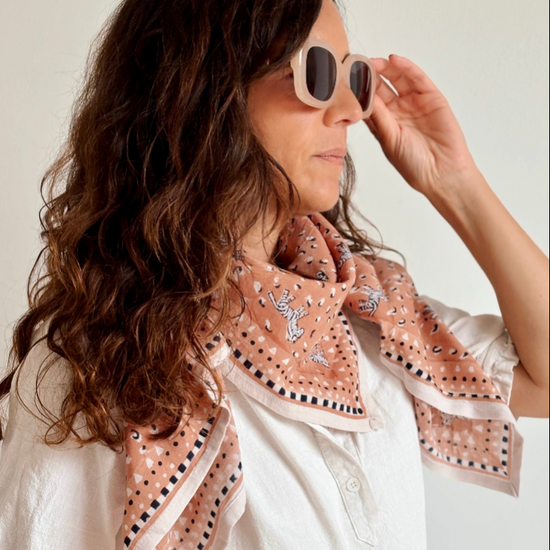 Nos foulards sont imprimés à la main à Jaipur avec la technique traditionnelle du block print. Chaque pièce est unique, avec ses petites irrégularités qui font tout son charme. Comme chaque collection est réalisée en série limitée, les couleurs varient d’une production à l’autre : votre duo est vraiment exclusif !