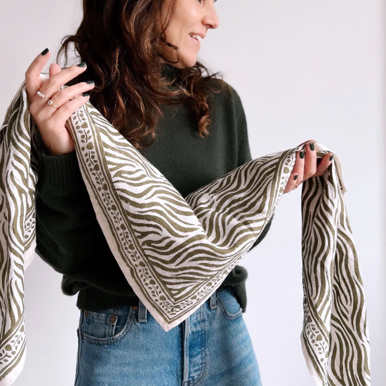 Nos foulards sont imprimés à la main à Jaipur avec la technique traditionnelle du block print. Chaque pièce est unique, avec ses petites irrégularités qui font tout son charme. Comme chaque collection est réalisée en série limitée, les couleurs varient d’une production à l’autre : votre duo est vraiment exclusif !