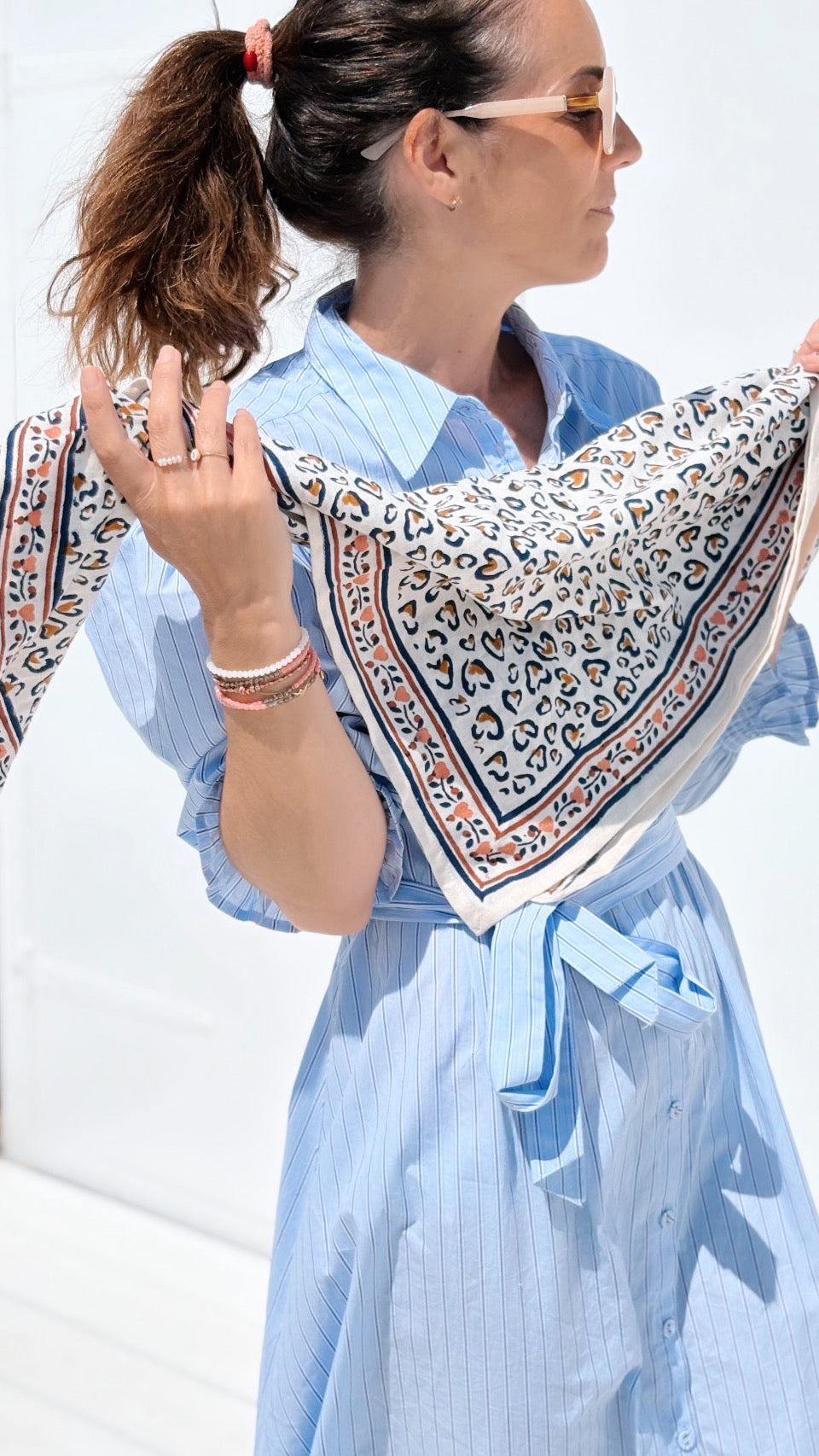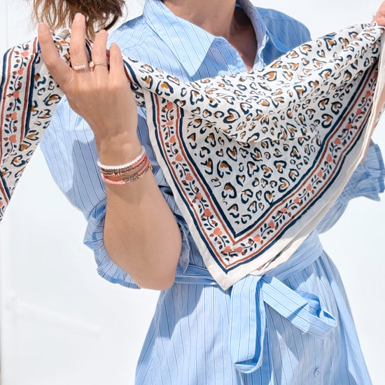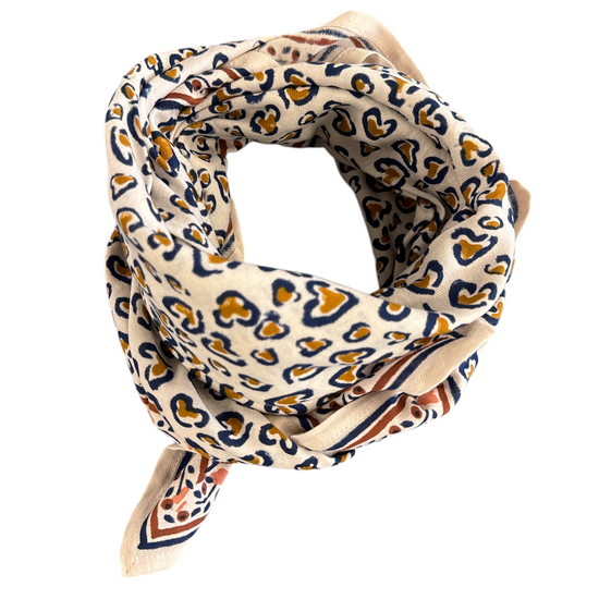 Il est confectionné artisanalement grâce à la technique indienne du block-print, les couleurs sont réalisées à partir de pigments naturels.