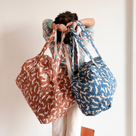 Ce sac a été imprimé de manière artisanale selon la technique d'impression blockprint et confectionné à Jaipur en Inde.